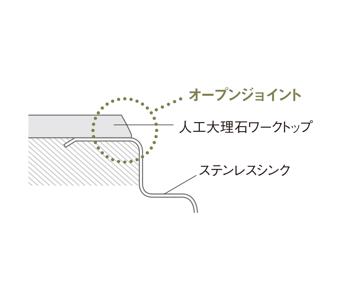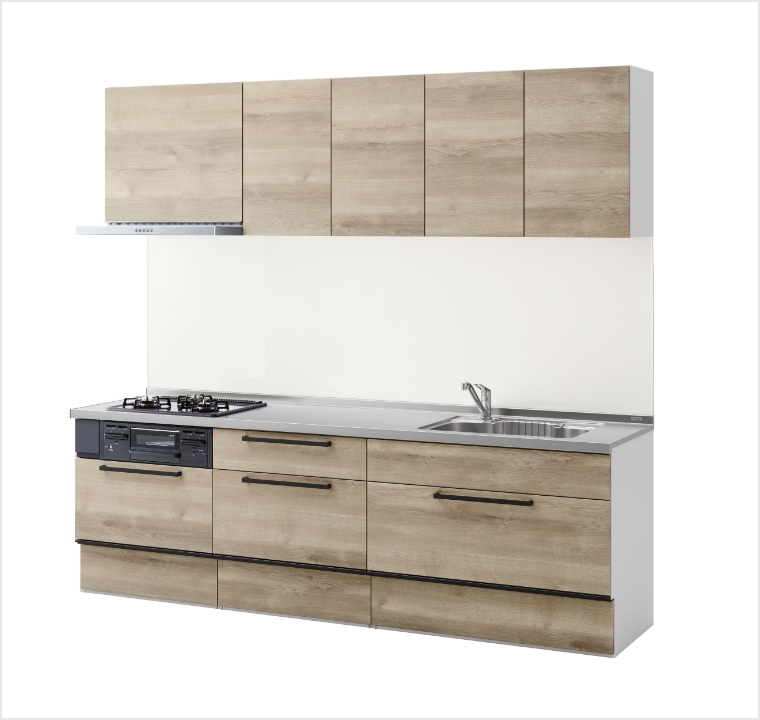 作業がしやすいL型だから2⼈での料理もゆったり広々と⾏えます。上品な⽊⽬のグラセウッドホワイトに⼈⼯⼤理⽯のワークトップ。