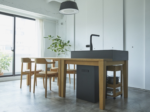 デュアルトップ対面キッチンに、コンバーチブル収納を組み合わせたシンプルなレイアウト。扉からワークトップ、さらにシンクまで全てモノトーンで統一し、海外のアパートメントをイメージさせるコーディネートに。