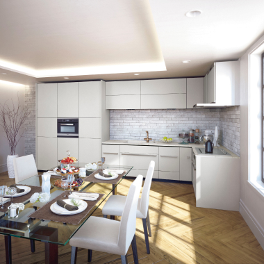 コンパクトなスペースに食器洗い乾燥機やハンドムーブなどの最新機能を上手に組み込んだプランです。夫婦二人の暮らしやマンションリフォームにふさわしい小さくても賢いキッチンです。