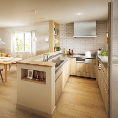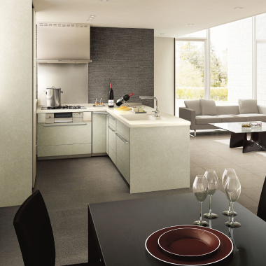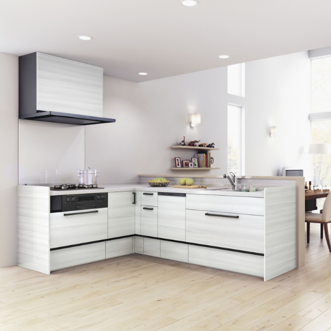 作業がしやすいL型だから2⼈での料理もゆったり広々と⾏えます。上品な⽊⽬のグラセウッドホワイトに⼈⼯⼤理⽯のワークトップ。