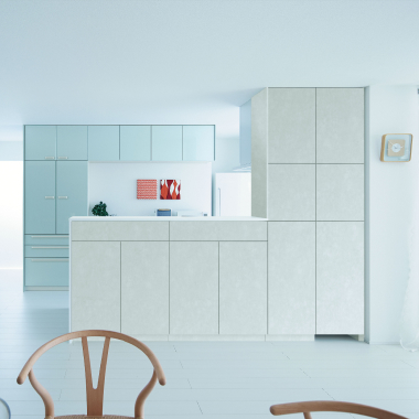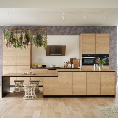 オークの天然木ワークトップとシェルフ、テーブルが創りだす明るくて温もりある空間。扉には石膏を思わせるマットな質感の爽やかなミースアッシュをセレクトしました。
