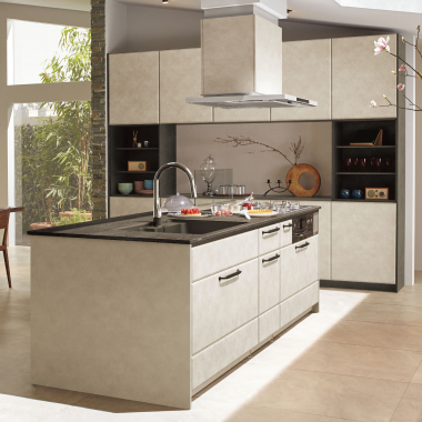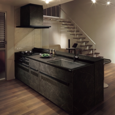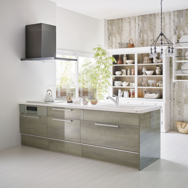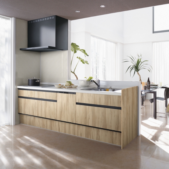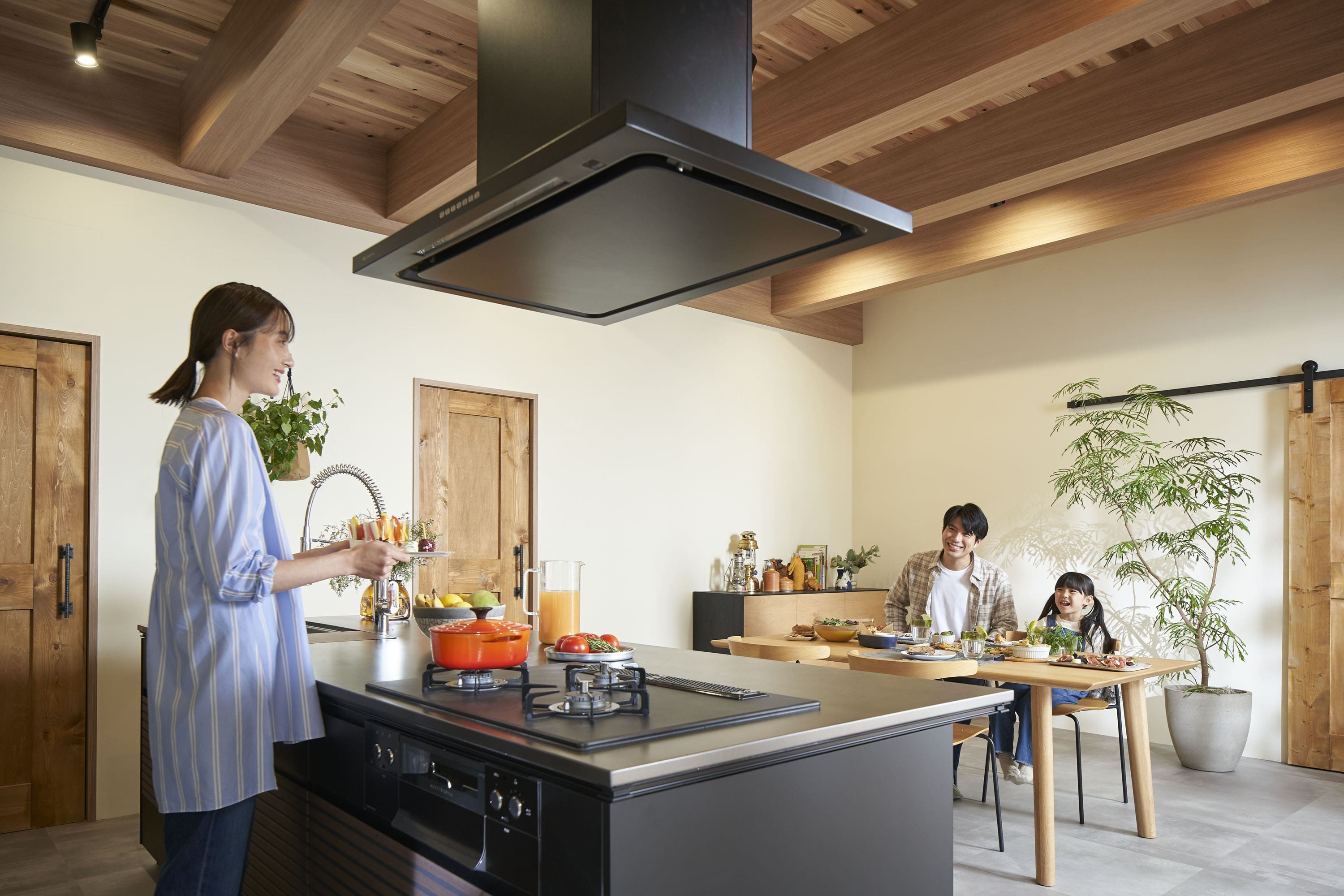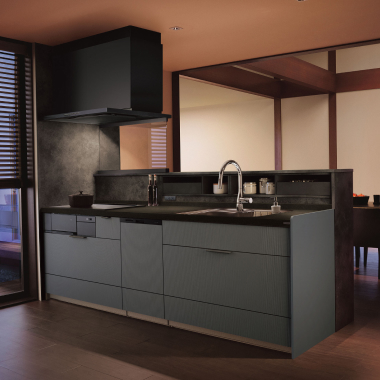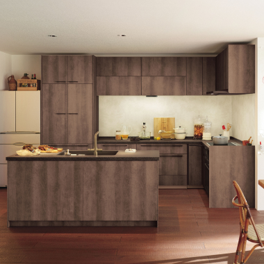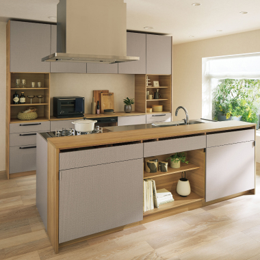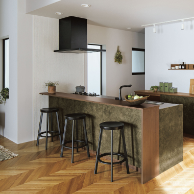 ルーバーを模した掘り込みはキッチンにウッディな雰囲気をもたらし、スタイリッシュな中にもぬくもりを感じさせます。周囲を回遊できるフラット対面のアイランドキッチンを、ダイニングキッチンの主役に。