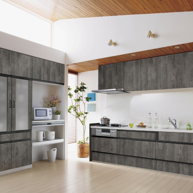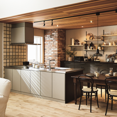 趣味性の⾼い家具やインテリアにもラスティチャコールの扉で、落ち着いた⼤⼈っぽさをプラスします。