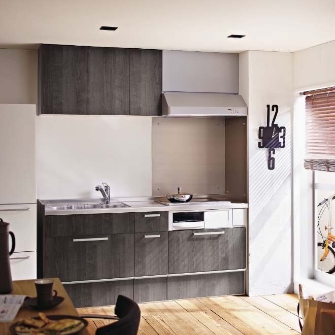 ⼩さなスペースでも、理想のキッチンをつくりましょう。お気に⼊りの⾊を選んだり、カウンターを付けたり、レイアウトを⼯夫したり。