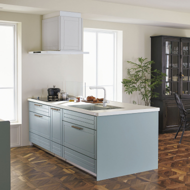 フレンチスタイルのアンティーク調を意識してブルーの扉に映えるよう水栓やレンジフードなどをホワイトに。流レールシンクのブルーグレー色を効果的に配して爽やかさも強調しています。