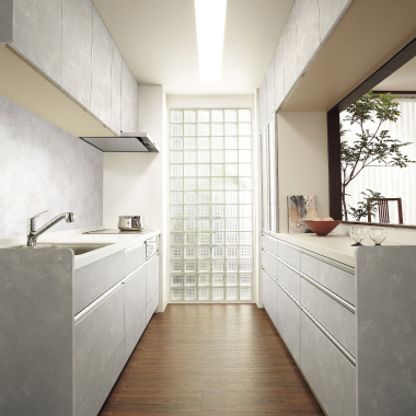 グレーの石目でコーディネートしたキッチンを主役にした2列型レイアウト。キッチンの扉と合わせたリビング収納を採用することで、リビングとの一体感が増し、上質で落ち着いた雰囲気を引き出します。