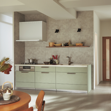 シンプルな壁付け I型キッチンと魅せる収納を上手にマッチングさせました。落ち着いたレフティグリーンの扉に、取手・シェルフ・吊戸棚をウォールナットで統一。