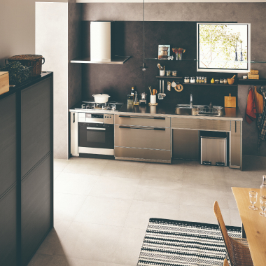 都会的な空間やナチュラルな空間にも馴染むダークカラーで合わせたステンレスコーディネートです。シンプルでありながら、細部にまでこだわりのあるキッチンプラン。