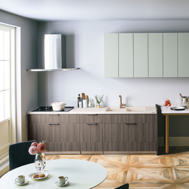 落ち着いた木の質感が楽しめるミースウッドの面材でアンティークなフローリングとマッチする上質コーデ。使いやすく収納力抜群の吊戸棚には、キッチン扉と色違いのミースグレーをセレクト。