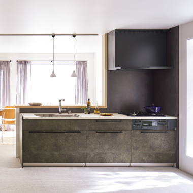 調理するエリアには落ちついたスタウトシリウス。リビング・ダイニングの家族エリアはカシミアエトープ。対面キッチンでは2つの扉面材の表情を使い分けあなたの思いをかなえる空間を演出可能です。