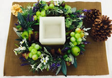 グリーンを主体にした作品は、今回も今野先生のオリジナルデザイン。ラベンダーなど食空間になじむお花や、葡萄、青りんごなどのフィギュアもふんだんに使用し、ドアはもちろん 、ダイニングスペースに飾ったり、キャンドルを真ん中に入れテーブルに置くなど様々な使い方ができます。ワンランク上のおもてなしができる素敵なリースに皆さんワクワクしながら制作されました。