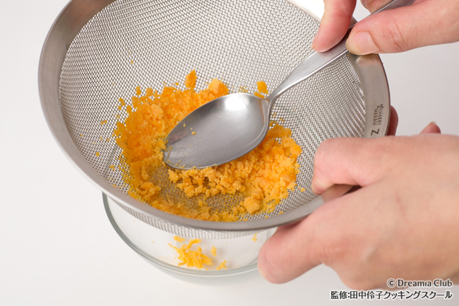 - ゆで卵は固ゆでにして白身と黄身を分け、白身は粗いみじん切り、黄身は裏ごしする。