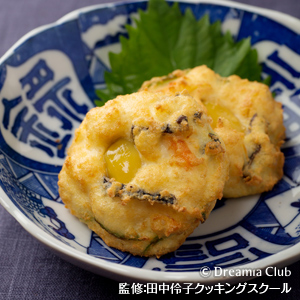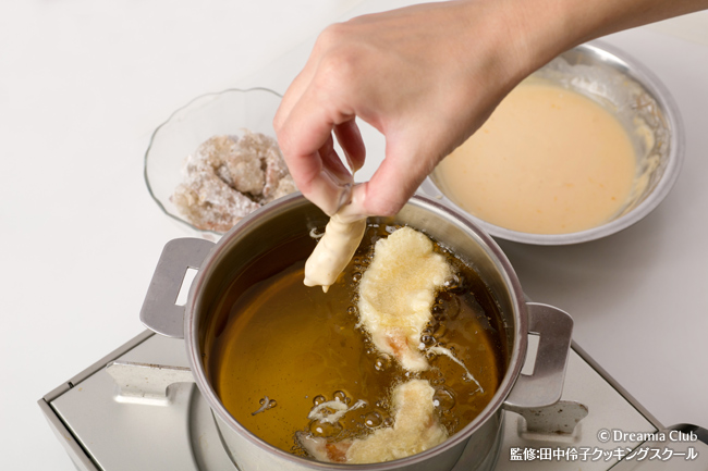 - 180℃の油に衣を付けた海老を入れて、カラッと揚げる。