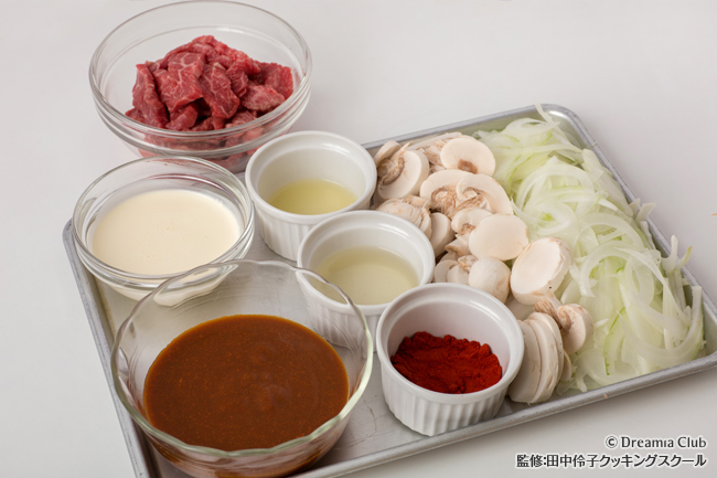 - 3にドミグラスソース、白ワイン、生クリーム、炒めた肉を入れてサッと煮る。塩、胡椒で味を整える。