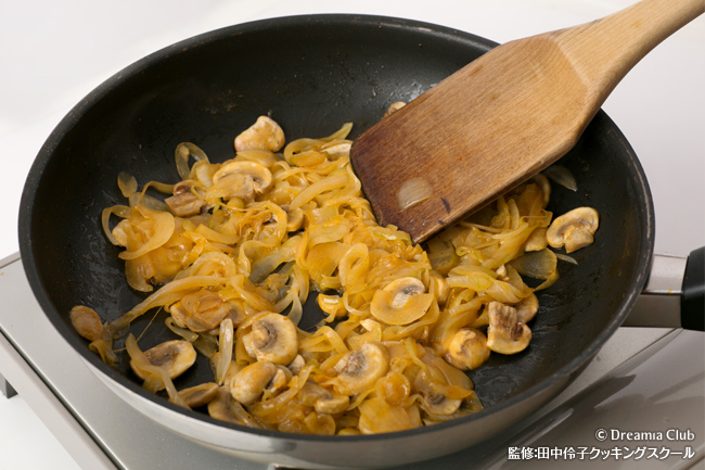 - 熱したフライパンに半量のバターを入れ、牛肉を強火でサッと焼いて取り出す。もう半量のバターを加え、玉葱、マッシュルームを入れて中火でしんなりするまで炒める。
