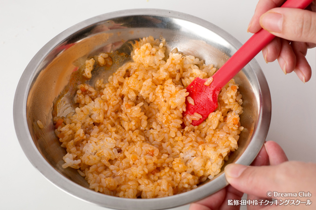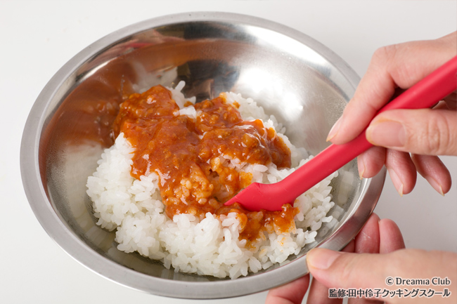 - ご飯とミートソースを合わせて、レンジで加熱しておく。