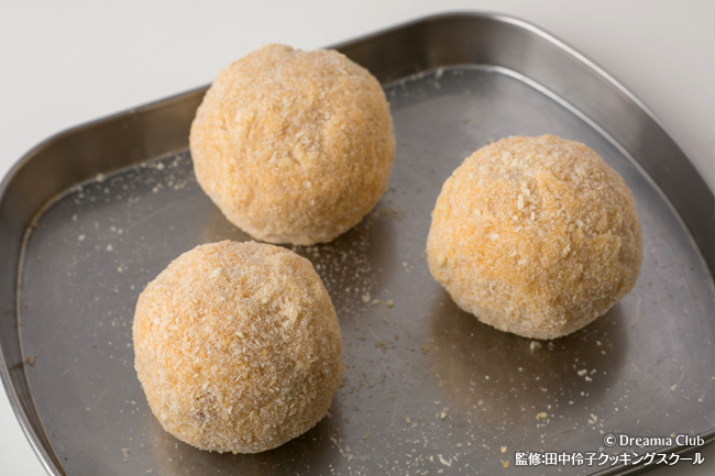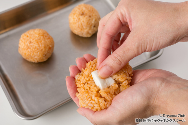 - 2が冷めたら、モッツァレラチーズを中心に詰めて丸める。