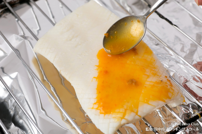 - 220℃のオーブンでイカを1分下焼きする。取り出してウニを塗り、2分焼く。