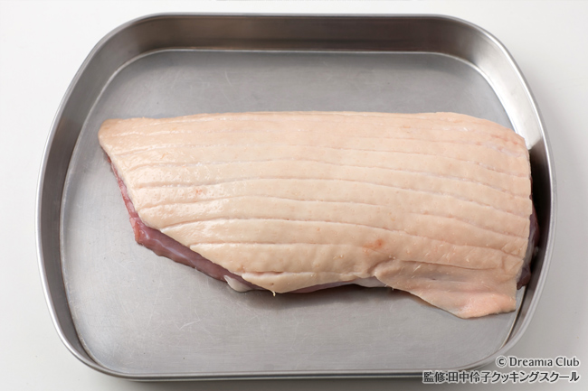 - 鴨むね肉は筋を取って、皮に5mm間隔で縦に切り込みを入れる。
