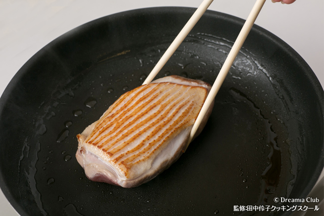 - フライパンを強火で熱して、皮目に焼き色を付ける。