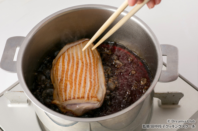 - 小鍋に漬け汁を沸かして2の鴨を入れ、ごく弱火で10分煮る。