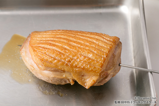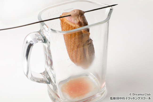 - 鴨を取り出して肉部分に金串を刺し、立てかけるか吊るすなどして血抜きをする。煮汁は冷ます。