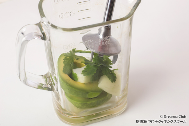 - 材料を全てボールに入れ、バーミックスなどで粗く潰す。塩、胡椒で味を整える。