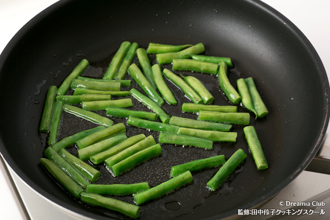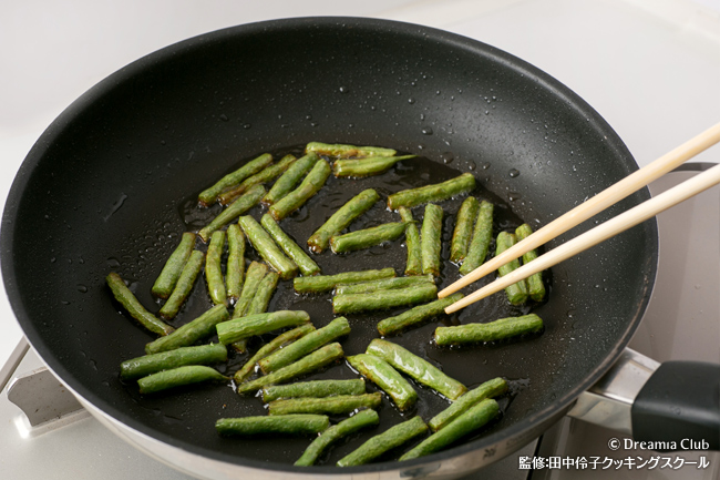 いんげんは生から多めの油で炒めて人入れると、旨味が詰まって美味しくなります。
