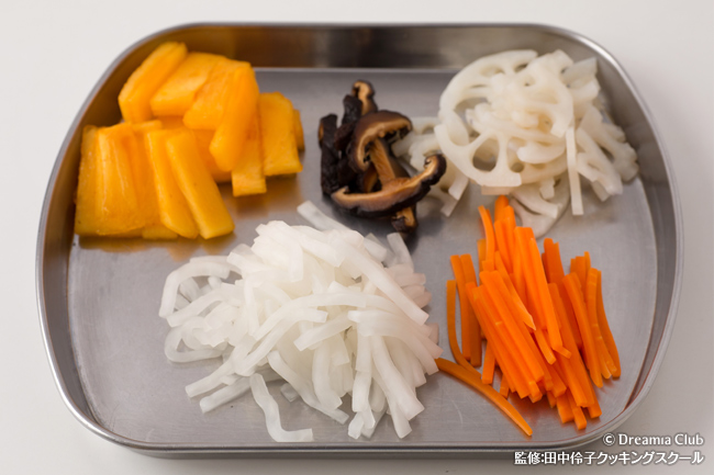 - 人参、蓮根は短冊に切り、サッと茹でておく。