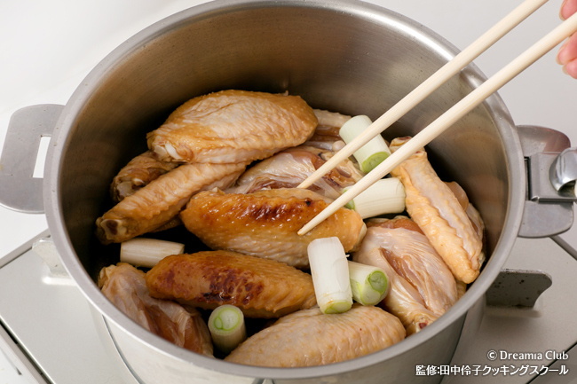 - 手羽先は醤油、酒で下味を付けて15分ほど置く。長葱はぶつ切りにする。