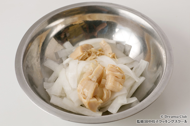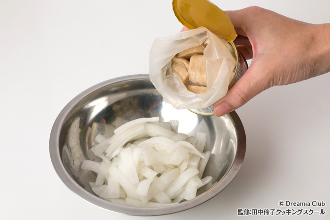 帆立の缶汁に旨味があるので、ぜひ缶汁も使いましょう。