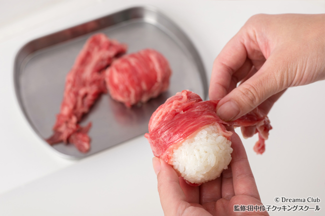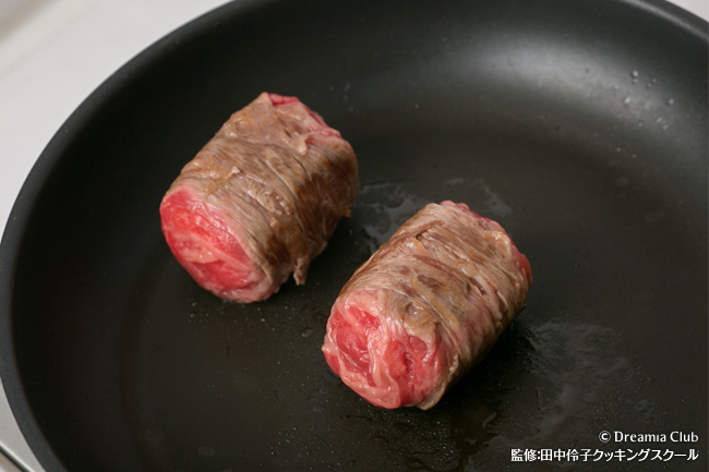 - 牛薄切り肉で1を巻き、巻き終わりを下ににして、フライパンで火が通るまで焼く。