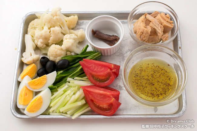 - 皿にサラダ菜を敷いて1を盛り、中央にツナをのせて、アンチョビー、オリーブ、ゆで卵を散らす。