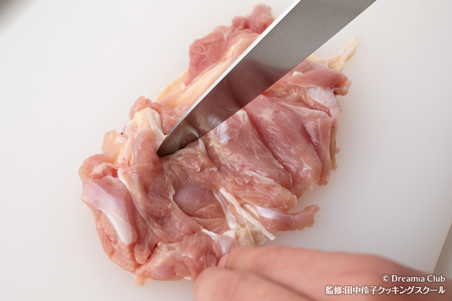 - 鶏肉は筋切りをして、塩、胡椒、小麦粉をふっておく。