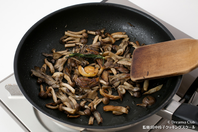 - フライパンを熱して、オリーブオイル、潰したにんにく、ローズマリーを入れ、キノコ類を加えて炒める。塩、胡椒をふって取り出す。