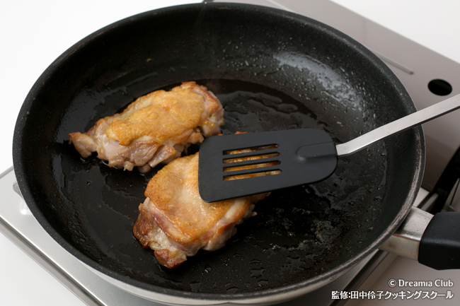 - 鶏肉を皮の方から両面をこんがり焼く。