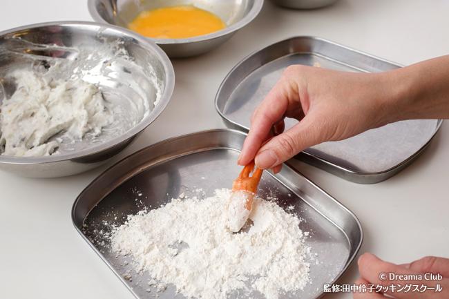 - 2に小麦粉、溶き卵、5mm角に切ったパンをまぶして、170℃の油で5分程揚げる。