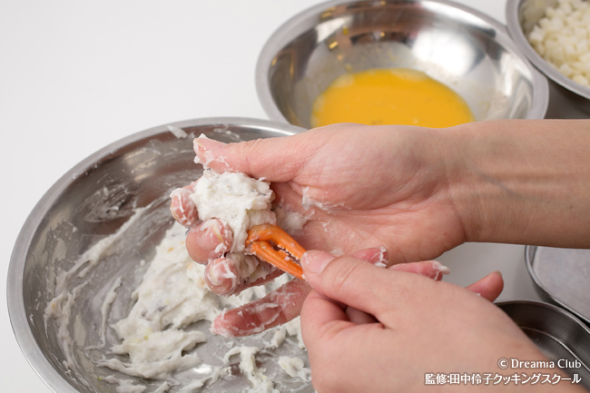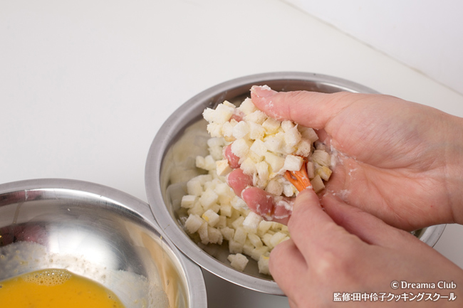 - 1にみじん切りにした長葱とAの調味料を混ぜ、小麦粉をまぶしたかに爪に付ける。