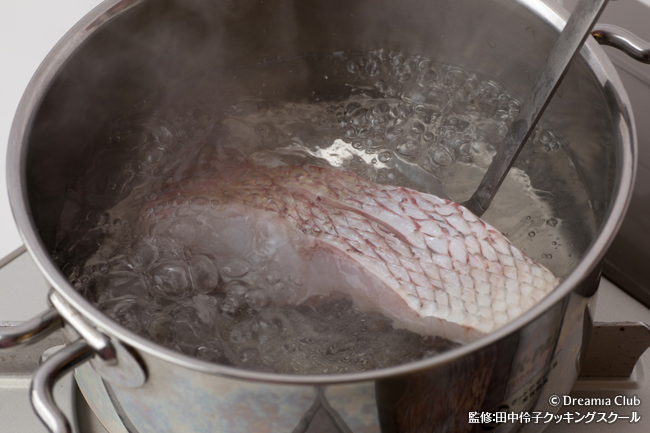 湯引きとは、熱湯にさっと通したり、熱湯をかけたりして、材料の表面だけに熱を通すことを指します。生臭みや表面の脂肪を除き、身を締める効果があります。鯛は骨付きのまま炊いた方が味が出ます。