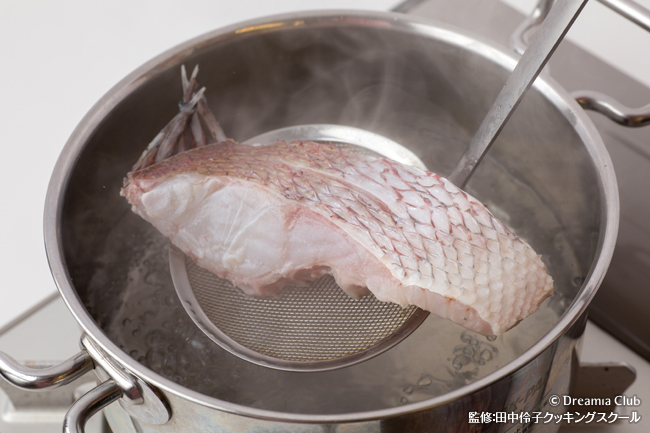 - 鯛の切り身はウロコが残っている場合にはきれいに取り、軽く塩をして、湯引きする。