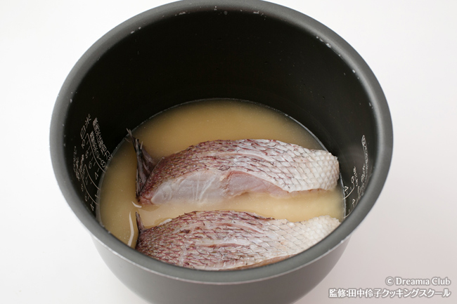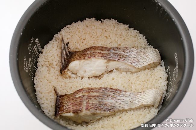 - 炊飯器に米を入れてAを入れる。だし汁を炊飯器の3合目盛まで入れ、鯛をのせて炊く。