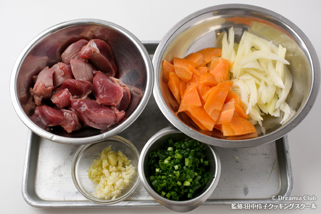 - セロリ、人参は薄切りにする。生姜、葱、にんにくはみじん切りにする。