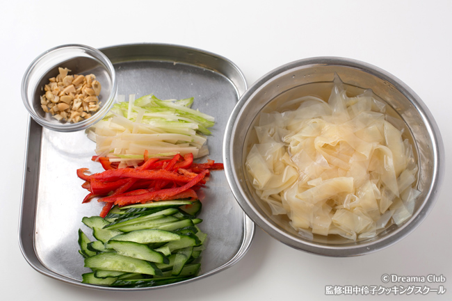 - セロリ、ピーマン、きゅうりを千切りにする。