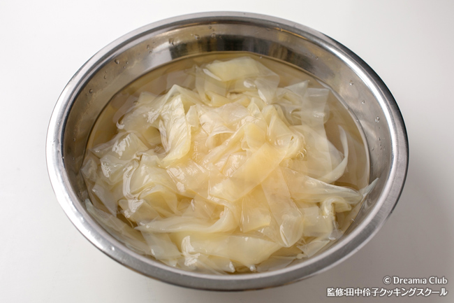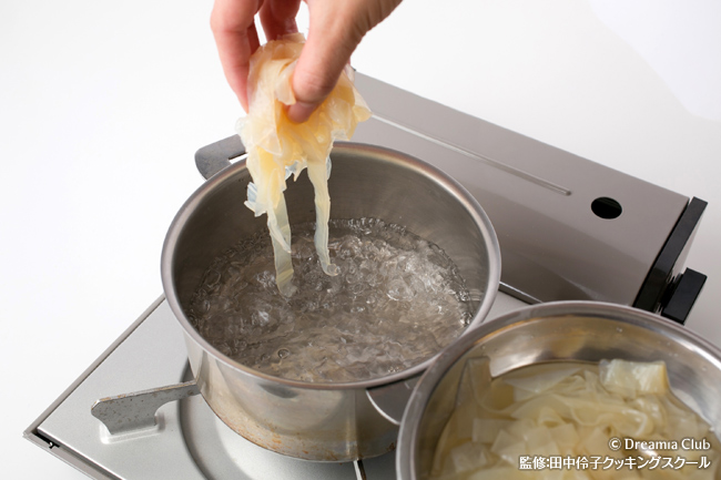 くらげは加熱しすぎるとゴムのように固くなるので、5秒ほど湯通ししてすぐに冷水で冷やしてください。(製品にもよるので、それぞれの説明書きに従ってください。)