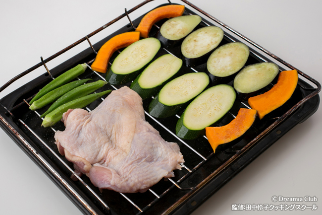 - 野菜は洗って一口大に切り、油をまぶして焼き網に並べ、塩をふる。