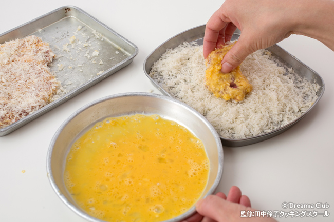- 更に、オイル卵、パン粉を付けて、中温(170~180℃)の揚げ油できつね色になるまで揚げる。