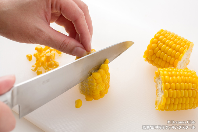 - トウモロコシは火が通るまで塩茹でにする。包丁で実を穂軸から外しておく。