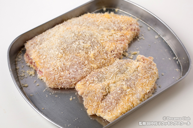 - 1の豚肉に2をはさんで、閉じ目を包丁の背で叩いておく。小麦粉、溶き卵、パン粉をまぶし、多めの油で揚げ焼きにする。