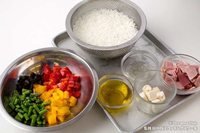 - たっぷりの湯に塩大さじ1を入れて米を13分茹でた後、水で洗ってオリーブオイル少々(分量外)をまぶしておく。