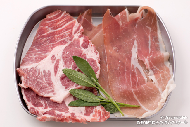 - 豚肉は薄く伸ばし、セージとプロシュートを貼り付けて、塩、胡椒、小麦粉をまぶす。